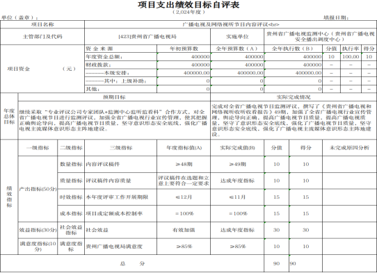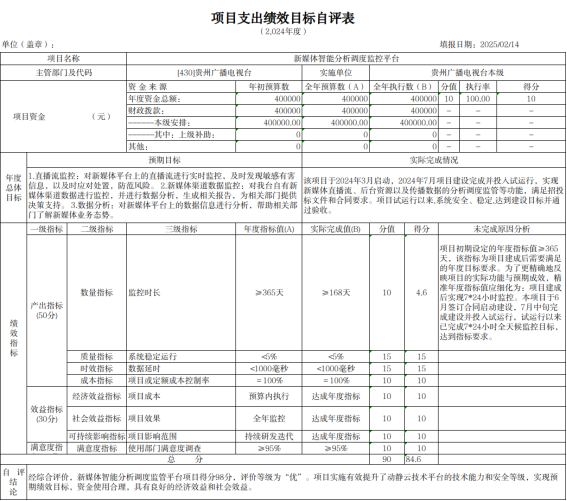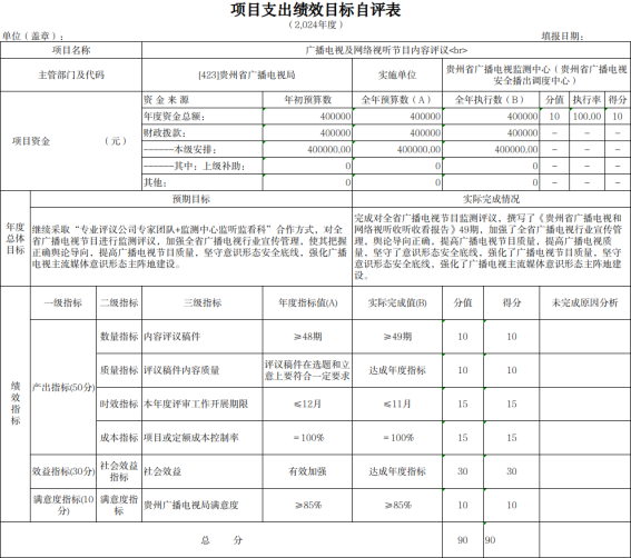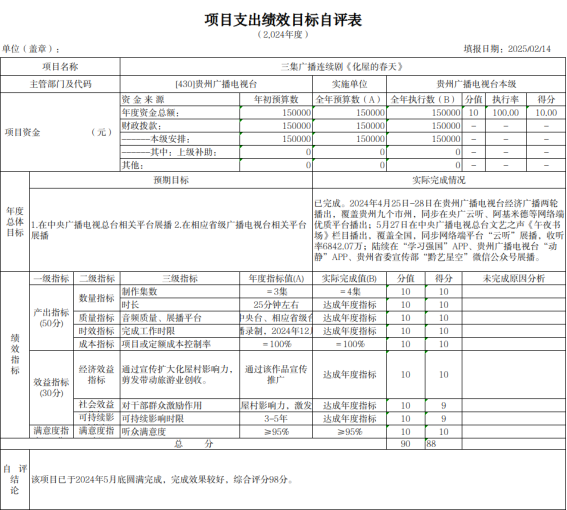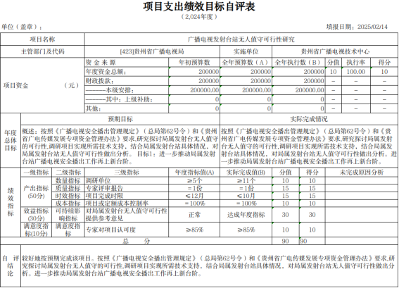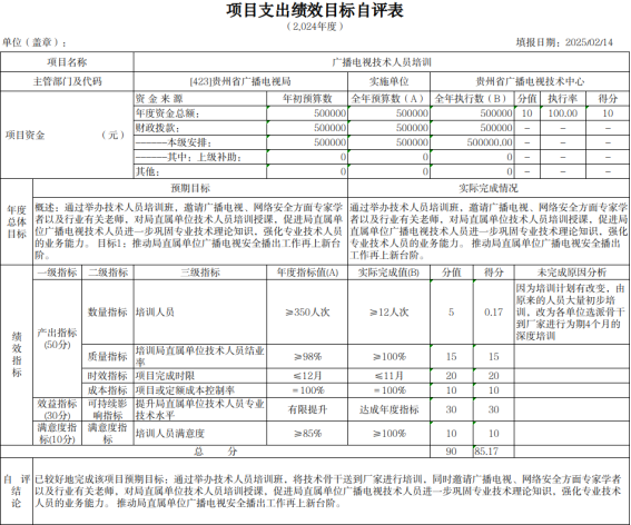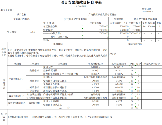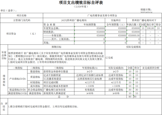 2025年3月,根据项目下达情况,我局下发《威尼斯人网址 关于开展2024年度项目支出绩效自评的通知》,并要求各单位结合2024年年初预算填报中项目绩效目标设定情况撰写项目支出绩效评价报告,报告包含立项情况、资金安排及使用情况、项目实施内容及进展情况、绩效目标完成情况、存在的问题及改进措施等。截止2025年5月,全省各市(州)广电主管部门、项目单位、局属单位已全部完成绩效自评工作,自评报告中预算执行率为98.38%,对资金使用情况、项目实施进展情况均做认真阐述,并取得了预期的社会效益。我局自评等级优。